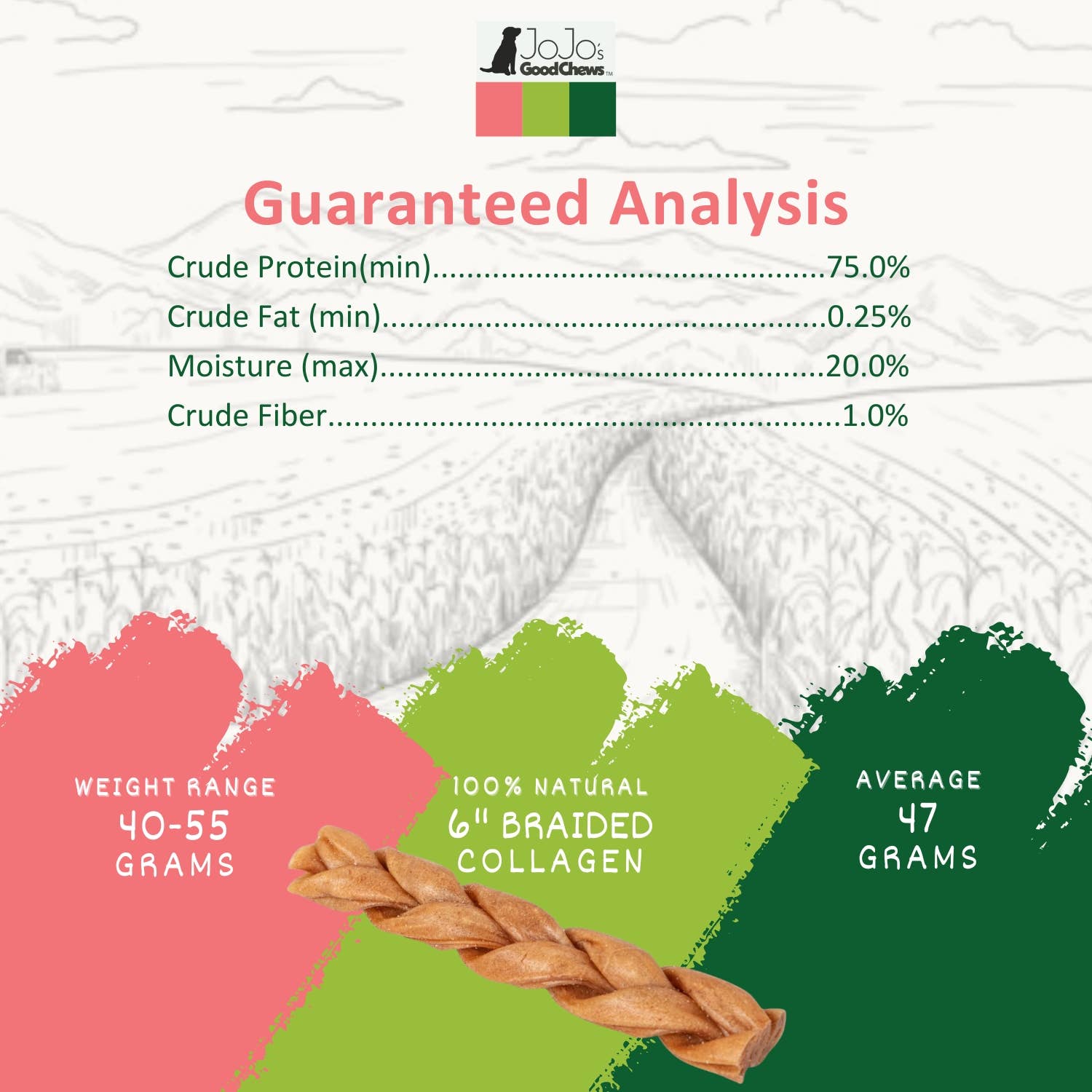 These 6-inch braided collagen dog chews (40g-55g) are made from 100% natural beef collagen, offering a safe, rawhide-free alternative that’s both highly digestible and odor-free. The durable braided design makes them a long-lasting dog treat that supports dental health, joint mobility, and skin and coat condition. Key Features: ✔ Natural Beef Collagen Dog Treat – Single-ingredient, high-protein chew ✔ 6” Braided Design – Increases chew time and durability ✔ Rawhide Alternative – Safer, cleaner, and easier to digest ✔ Supports Joint, Skin & Coat Health – Naturally rich in amino acids ✔ Grain-Free & Odor-Free – No fillers, preservatives, or artificial additives Perfect for medium to large dogs.